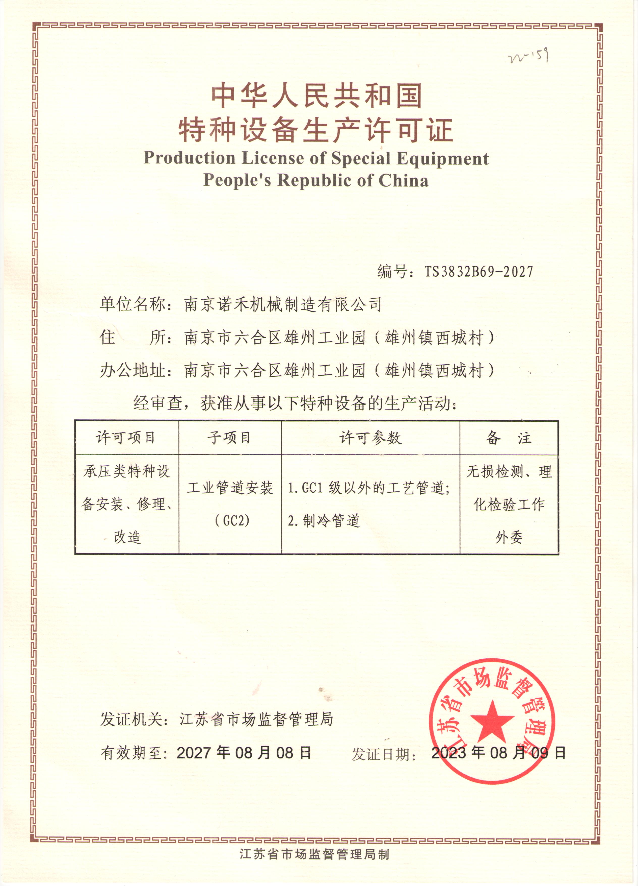 公司取得GC2工業管道安裝資質; 證書編號:TS3832869-2027