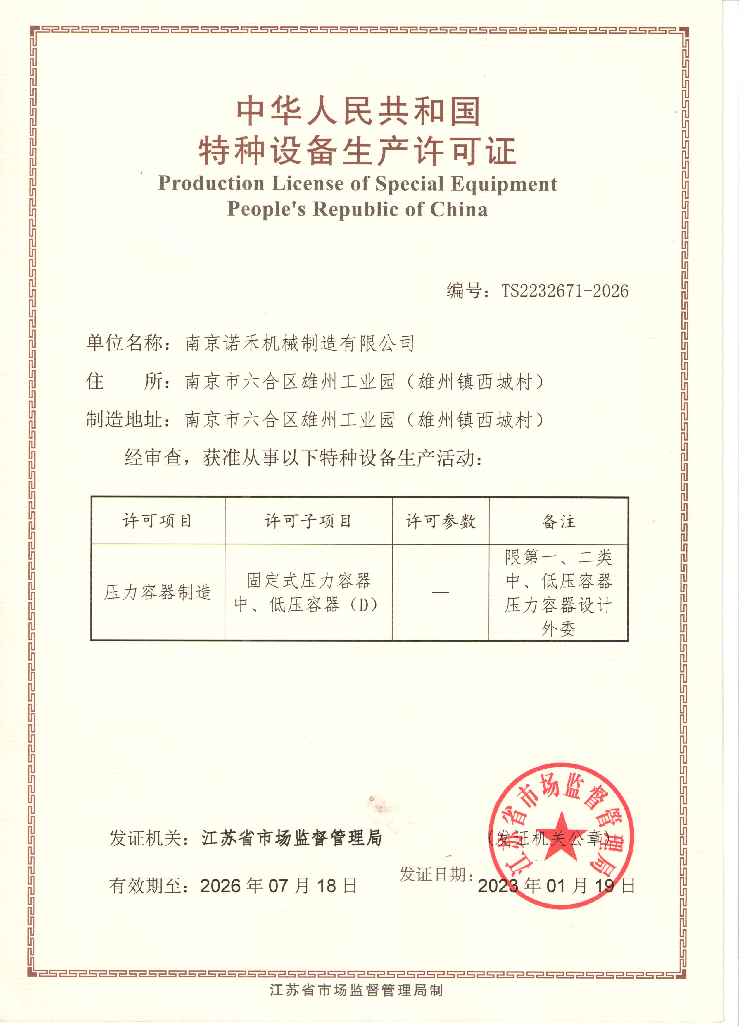 公司取得一、二類壓力容器生產資質; 證書編號:TS2232671-2026